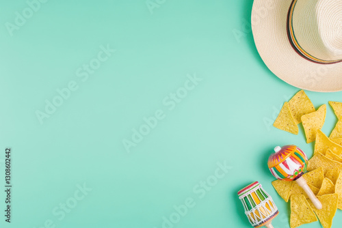 Sombrero and maracas with tortilla chips on a colorful stylish background
