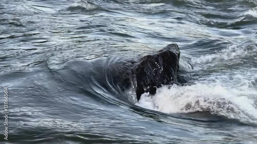 Rapid River Water Flows Around a Dark Rock, Creating Whitewater and Foam, in slow-motion