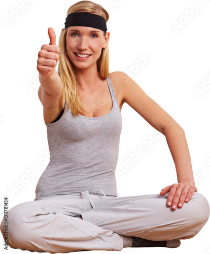 Frau in Turnhalle hält Daumen hoch