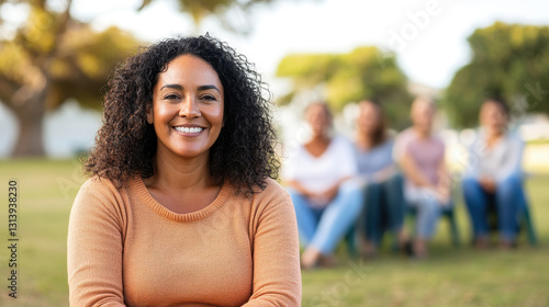 Smiling therapist leading a diverse mental health support group outdoors