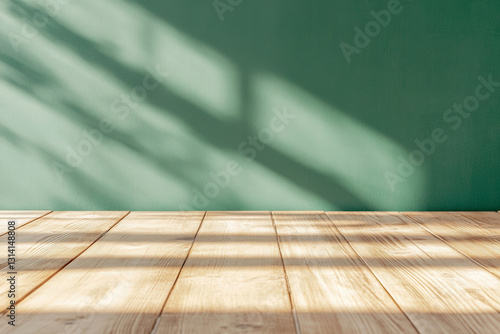 Wooden table top with green wall and light shadow contrast