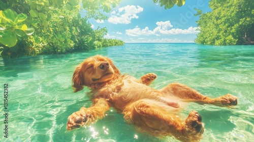 Golden retriever wearing sunglasses relaxing in the water on a sunny day
