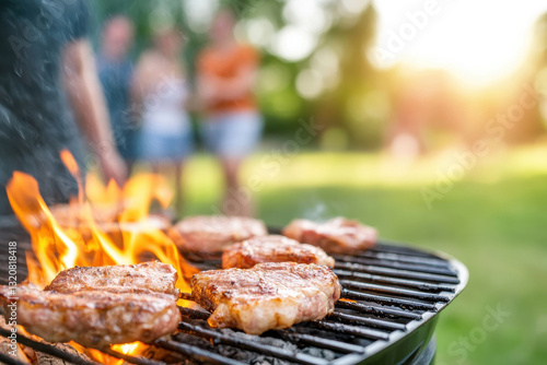 Barbecue grill with sizzling meat during a gathering in the outdoors