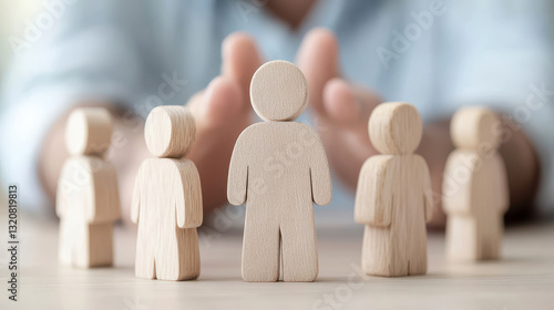 Hand protecting wooden figures symbolizing people and unity on a desk