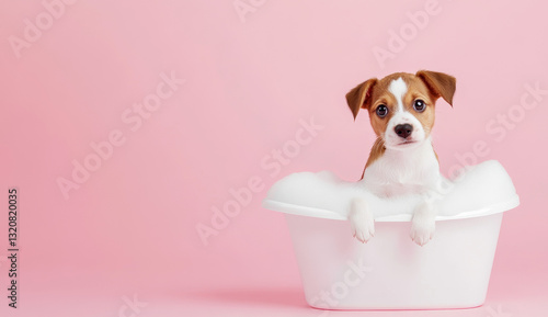 Adorable puppy sitting in a tub surrounded by soap foam on pink background