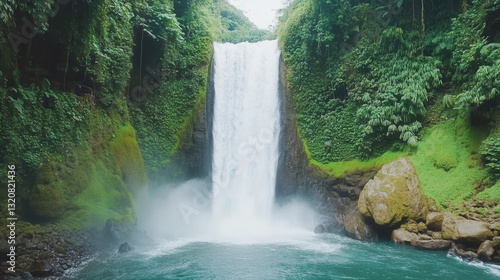 Tranquil waterfall in a lush tropical forest with clear cascading water