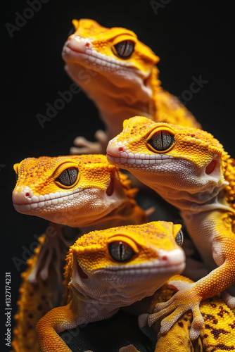 Close-up of vibrant geckos grouped on a dark background