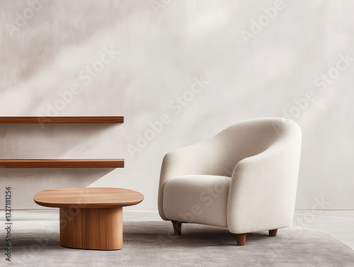 Modern minimalist furniture setup featuring a chair and wooden coffee table