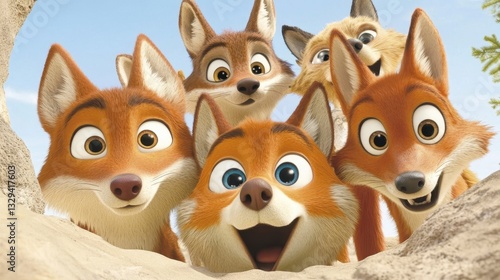 A cheerful group of cartoon bears expressing excitement in a sunny forest