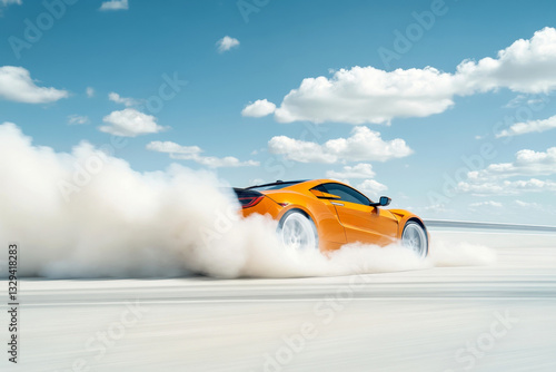 A sports car accelerating dramatically surrounded by a colorful smoke cloud
