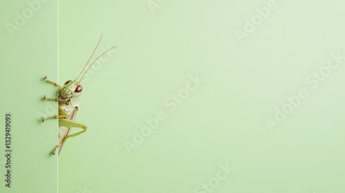 Curious grasshopper peeking behind a green corner wall in close-up view