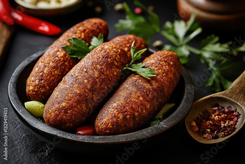 Traditional Lebanese kibbeh served on a dark plate with vibrant seasoning