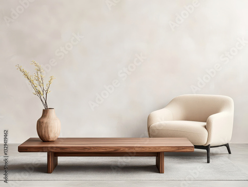 Modern interior with armchair, wooden table, and decorative vase on carpet