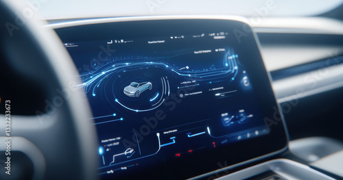 Futuristic EV car interior with dash board and control panels (Generative AI)