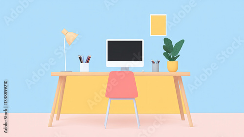 Modern workspace with computer, desk decor, and indoor plant against colored background