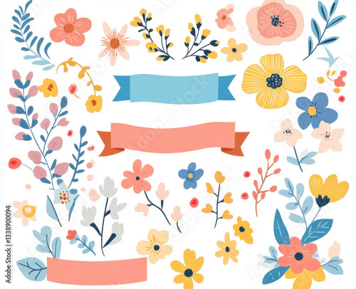 Floral decorations with colorful flowers and ribbons for creative projects