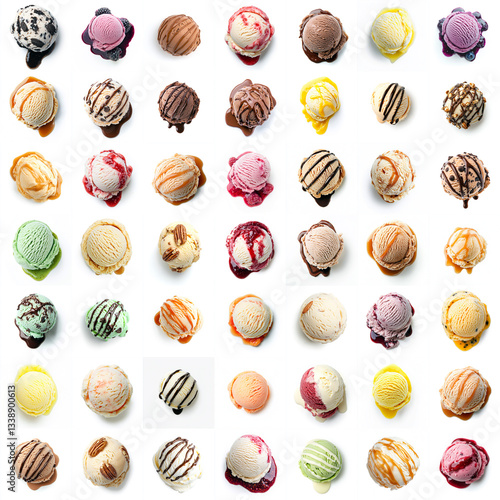 Assorted ice cream scoops with various toppings on a white background