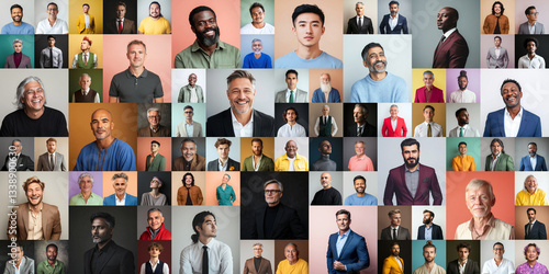 Diverse group of individuals in colorful clothes smiling confidently in professional portraits