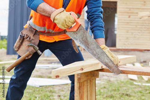 Zimmermann sägt Holz mit dem Fuchsschwanz