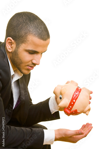 Geschäftsmann steckt Banknoten in Sparschwein