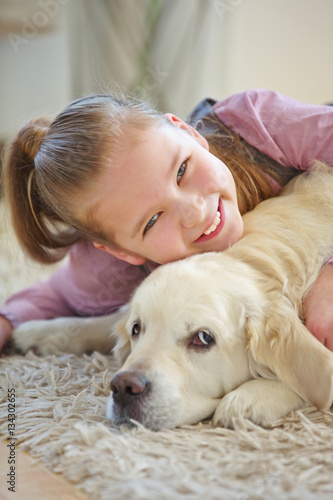 Kind kuschelt mit Golden Retriever Hund
