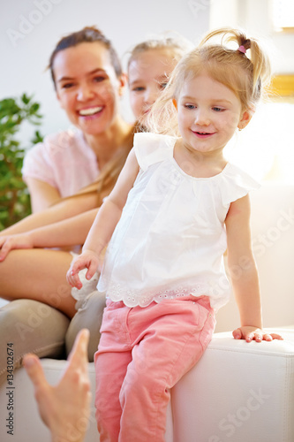 Familie mit Kuchen zu Hause im Wohnzimmer