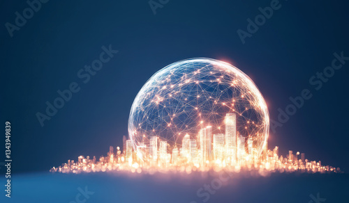 Illuminated cityscape connected by glowing lines, depicting modern technology and networks