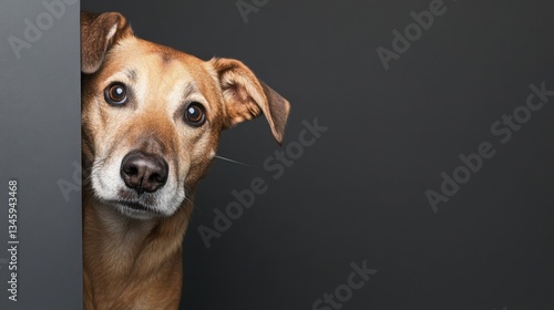 Curious dog peeking around a corner against a plain dark background