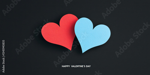 Red and blue paper heart shapes on black background celebrating love
