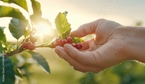 Hands harvesting ripe coffee cherries at sunrise in the plantation