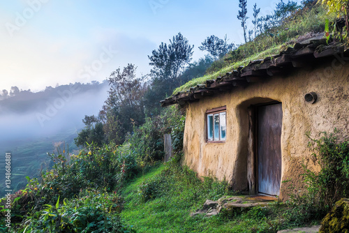 Rustic mountain lodge amidst scenic landscape with wooden architecture