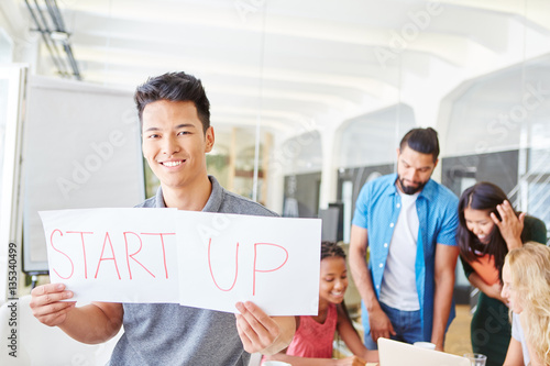 Start-Up Mann hält Zettel hoch