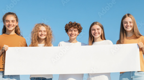 Group of happy teenagers holding a white banner on a sunny day outdoors