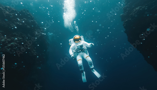 Astronaut exploring underwater depths surrounded by cinematic blue ocean scenery
