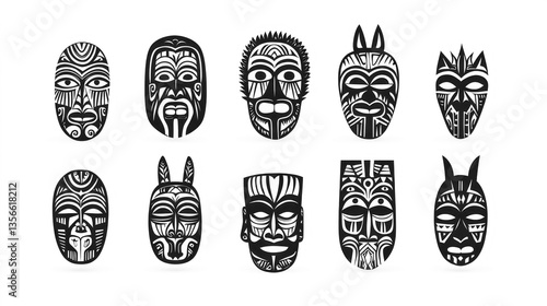 Polynesian tribal mask designs featuring intricate traditional patterns
