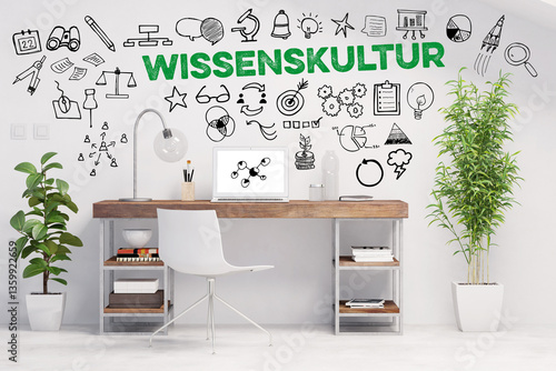 Schreibtisch mit Schriftzug „Wissenskultur“ als Konzept