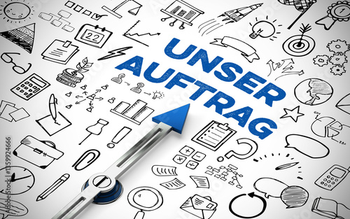 Kompass zeigt auf Schriftzug Unser Auftrag zwischen Icons als Business Konzept