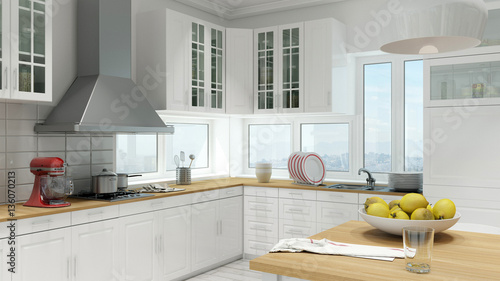 Helle Küche in moderner Wohnung mit Möbeln