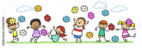 Viele Kinder in der Natur mit bunten Blumen