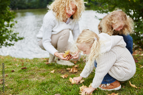 Mutter mit Kindern sammelt Blätter