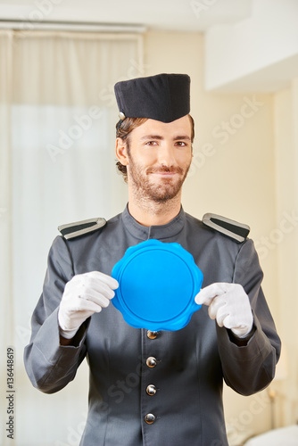 Freundlicher Page in Uniform mit Muskelarmen als Service Konzept