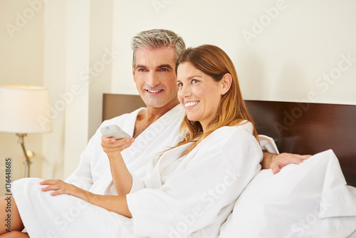 Paar im Hotel liest Zeitung und schaut auf Tablet