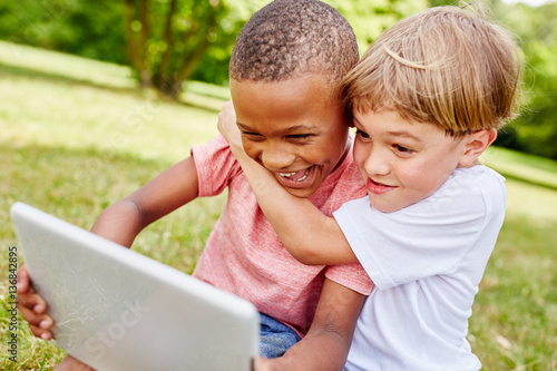 Zwei Kinder haben Spaß am Tablet PC