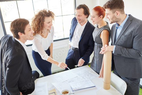 Silhouetten von Geschäftsleuten vor Collage aus vielen Mitarbeiter Portraits