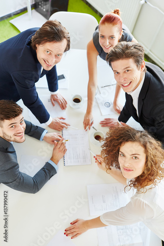 Silhouetten von Geschäftsleuten vor Collage aus vielen Mitarbeiter Portraits