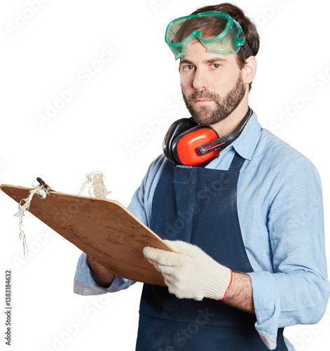 Monteur im Blaumann mit Helm und Maulschlüssel