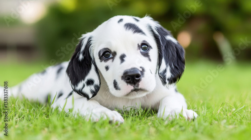 Dalmatian puppy lying on grass in a sunny garden landscape