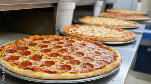 Fresh pepperoni pizzas lined up in a professional kitchen setting