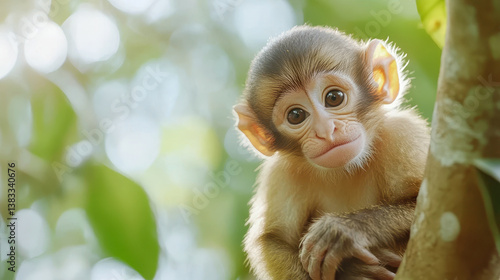 Young monkey clinging to a tree branch, with curious eyes, in a vibrant tropical forest setting