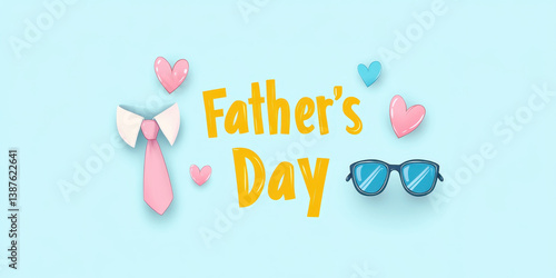 Creative Father's Day concept with glasses, tie, and mustache with heart shapes on a blue background